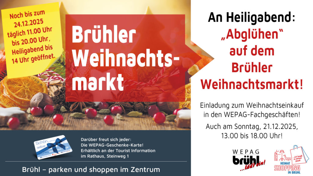 WEPAG lädt zum verkaufsoffenen Sonntag am 4. Advent – Festliches Shopping in der Brühler Innenstadt Die WEPAG Werbe- und Parkgemeinschaft Brühl e.V. lädt am 4. Advent, Sonntag, 21. Dezember, zum großen Last-Minute-Shopping in die Brühler Innenstadt ein. Von 13:00 bis 18:00 Uhr öffnen zahlreiche Geschäfte ihre Türen und bieten Besucherinnen und Besuchern die perfekte Gelegenheit,…