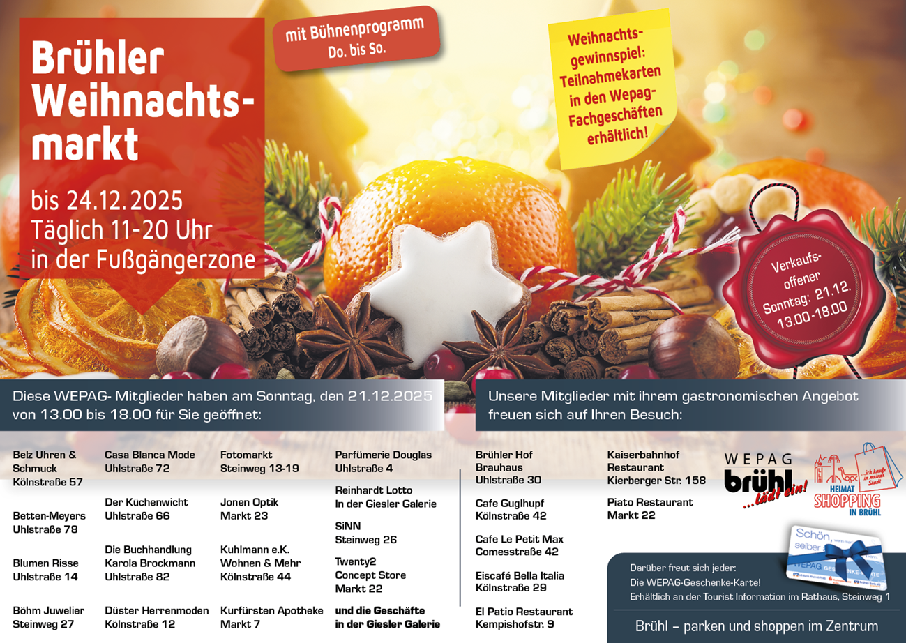 Seit 1981 verwandelt sich die Innenstadt in der Weihnachtszeit rund um den Markt in ein stimmungsvolles Weihnachtsdorf, das von tausenden Lichtern angestrahlt und einem großen, herrlich geschmückten Tannenbaum überragt wird. Auch in diesem Jahr prägen bis zum Heiligen Abend wieder rund 40 phantasie- und liebevoll gestaltete Stände das Bild der Brühler City. Den Besucherinnen und Besuchern aus Brühl sowie allen Gästen von nah und fern bietet er ein reichhaltiges Angebot, das von nützlichen Gebrauchsartikeln über nostalgischen wie originellen Weihnachtsschmuck für zu Hause bis hin zu den vielfältigen Geschenkideen aus den Werkstätten des Kunsthandwerks, alles hat, was das Herz begehrt. Eine ausgesuchte Gastronomie mit deftigen und süßen Speisen und heißem Glühwein für große und Kinderpunsch für kleine Gäste runden das Angebot ab. Offiziell wird der Weihnachtsmarkt am 25. November 2025 um 17 Uhr durch Bürgermeister Dr. Marc Prokop eröffnet. Eingebunden in den Weihnachtsmarkt ist der verkaufsoffene Sonntag am 21. Dezember 2025 von 13.00 bis 18.00 Uhr.