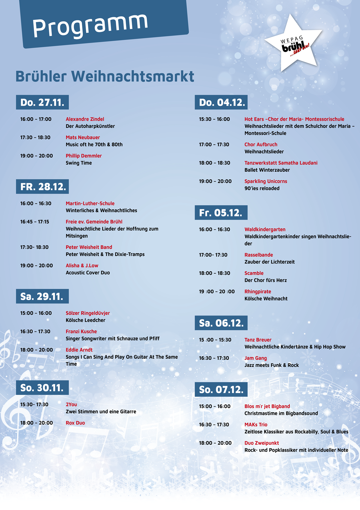 Die offizielle Eröffnung des Weihnachtsmarkts mit dem Bürgermeister der Stadt Brühl findet am 25. November um 17 Uhr vor der Bühne statt.